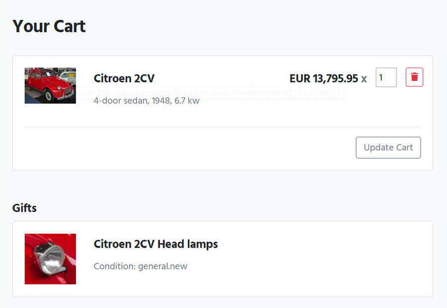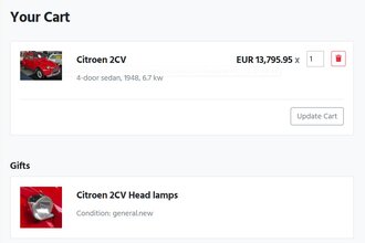 Add a red Citroen 2CV or a yellow Citroen 2CV to your cart and get a gift product for free.